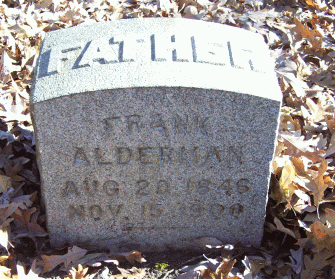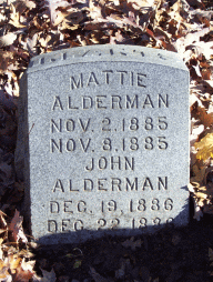 William Frank Alderman August 20, 1846 ~ November 15, 1900 Martha Jane (McKee) Alderman July 21, 1855 ~ February 1, 1903 Mattie Alderman November 2, 1885 ~ November 8, 1885 John Alderman December 19, 1886 ~ December 22, 1886 |
