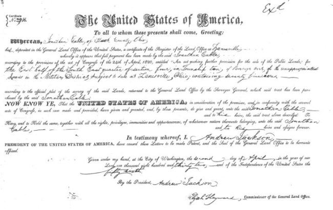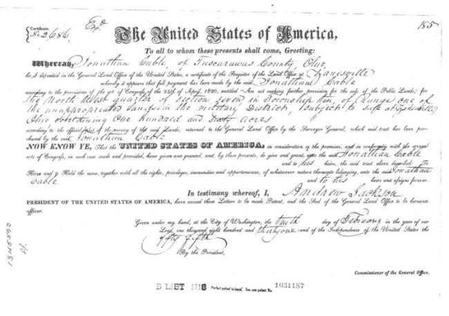 | The East half of the Southeast quarter of section four in Township ten of range one of the unappropriated land in the Military District subject to sale at Zanesville, Ohio containing seventy-five acres. April 2, 1832 |
