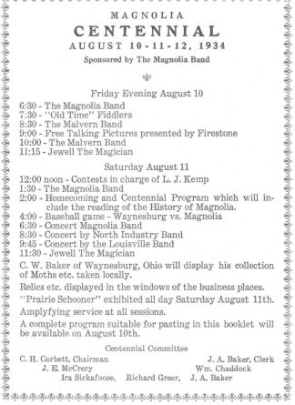 | In 1934, Magnolia, Ohio marked its 100 year anniversary. Some pages are transcribed from the booklet prepared for the celebration. Much documented history and interesting stories of those who lived among the Indian tribes. Many photos throughout of the companies, people and the town. |