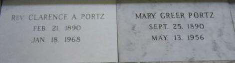 Rev. Clarence A. Portz February 21, 1890 - January 18, 1968 Mary Elson (Greer) Portz September 25, 1890 - May 13, 1956 Edgewood Mausoleum, Right Side, Row 2