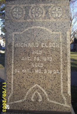 | Richard Elson Inscription on front of monument Richard died Aug 25, 1879 according to the death records. Inscription is incorrect |
